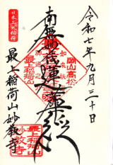 最上稲荷の御朱印!最上稲荷は、岡山県岡山市北区高松稲荷にある日蓮宗の寺院で、正式名称は最上稲荷山妙教寺です。天平勝宝4年(752年)に報恩大師が孝謙天皇の病気平癒の勅命を受け、吉備山中の八畳岩で修法し最上位経王大菩薩を感得して全快したことに始まり、天皇は祈願所として龍王山神宮寺を寄進創建したと伝えられ、現在の妙教寺と言われています。明治初年の廃仏毀釈の被害を逃れて特別に神仏習合の祭祀形態が許され、日蓮宗系「神仏習合」の祭祀形態の鳥居、しめ縄の架けられた神宮形式の本殿(霊光殿)などが現在も数多く残しています。伏見、豊川に並ぶ日本三大稲荷の一つともされ、毎年正月三が日は県下最多の参拝客が訪れています。 ![]() ![]() 御首題(御朱印)は、本殿(霊光殿)の左側にある祈祷受付で頂きました。 ![]() ●最上稲荷の概要 【 読み方 】さいじょういなり 【 山 号 】最上稲荷山 【 院 号 】 【 寺 号 】妙教寺 【 別 称 】高松稲荷 【 正式名 】最上稲荷山妙教寺 【 宗 派 】日蓮宗 【 本 尊 】久遠実成本師釈迦牟尼仏、最上位経王大菩薩(祈祷本尊) 【 所在地 】岡山県岡山市北区高松稲荷712 【アクセス】JR吉備線 備中高松駅から徒歩43分(約3km) 【公式サイト】https://inari.ne.jp/ 正確な情報を掲載するよう努力を致しておりますが、不正確な記載や誤字等の場合もありますのでご了承ください。